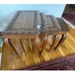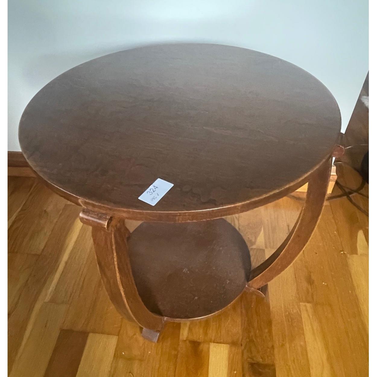 An unusual triple leg support coffee table with lower shelf - dimensions 1.5ft diameter x 18" height approx