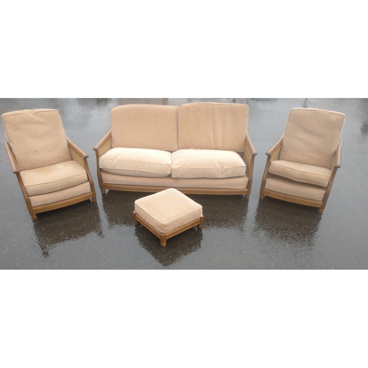 An ERCOL three piece suite comprising a three seater couch and two armchairs - with bergere sides and all in good condition and extremely