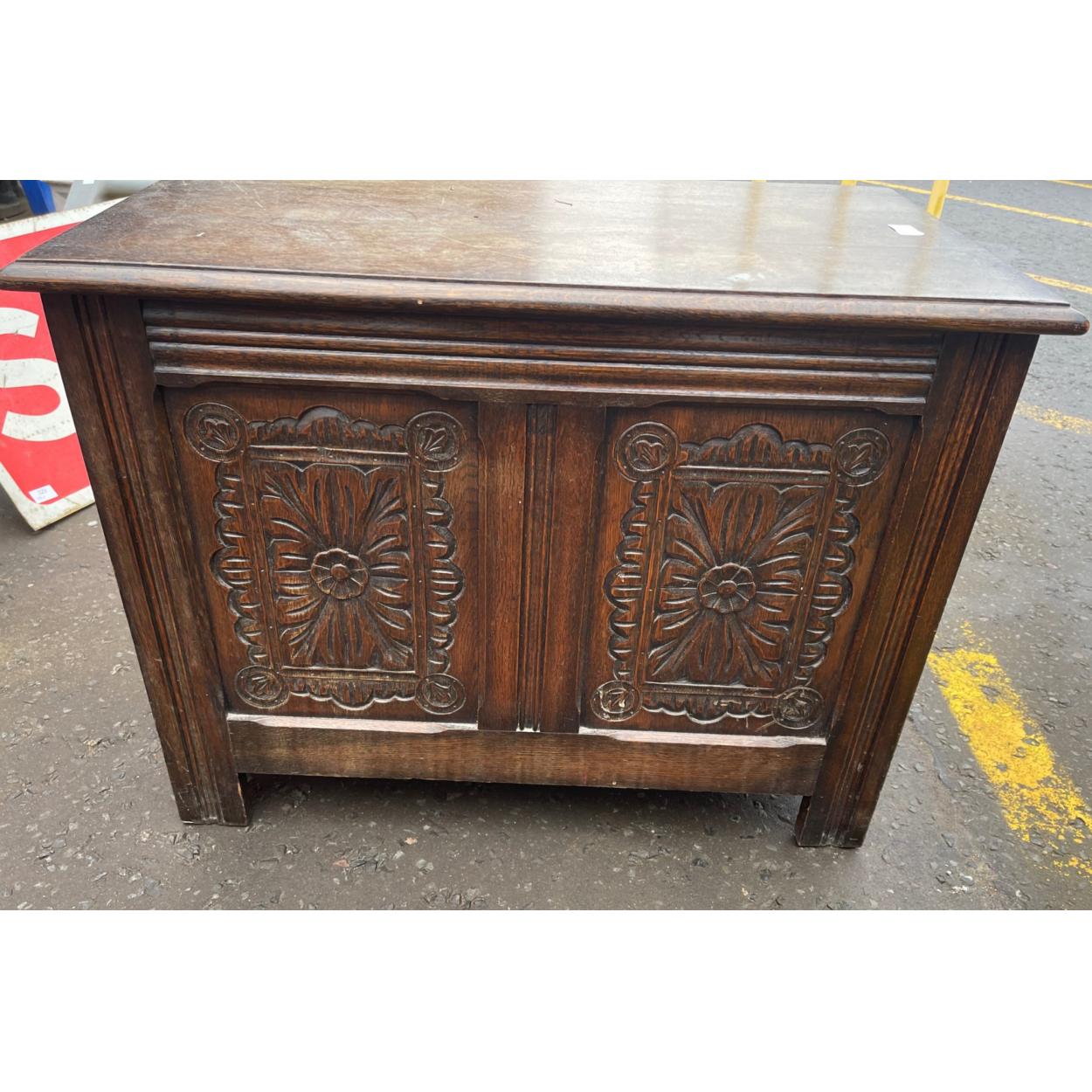 A vintage small carved wooden lidded storage box - dimensions 2 ft wide x 18" depth x 18" height approx