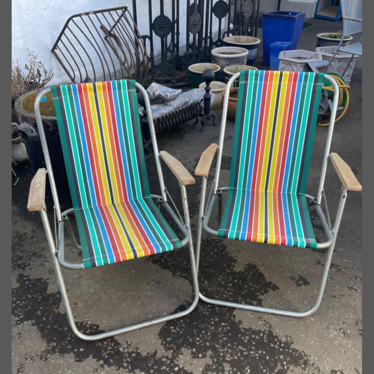 A pair of handy folding beach style chairs with nylon stripey covering