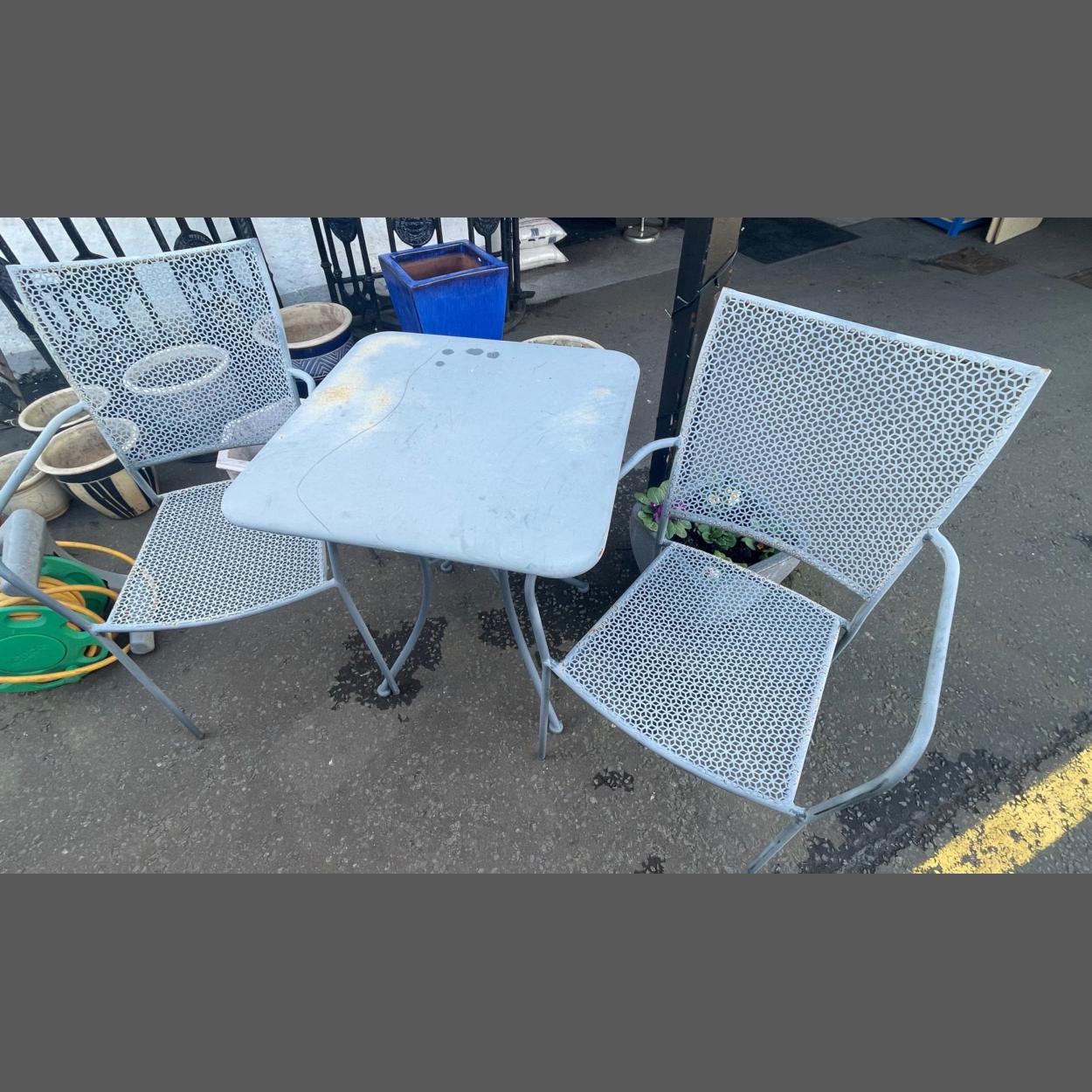 A PRETTY and ROBUST metal garden table with two matching chairs - just perfect for that late summer evening 'sitooterie'