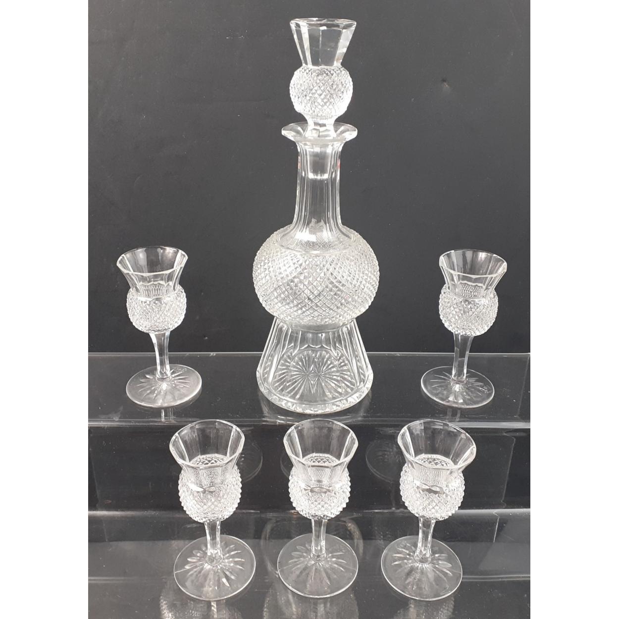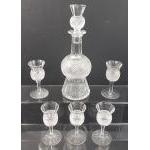 A small decanter (21cm high) in the Edinburgh crystal thistle pattern with 5 small liqueur glasses with Edinburgh crystal etched to the base of each glass