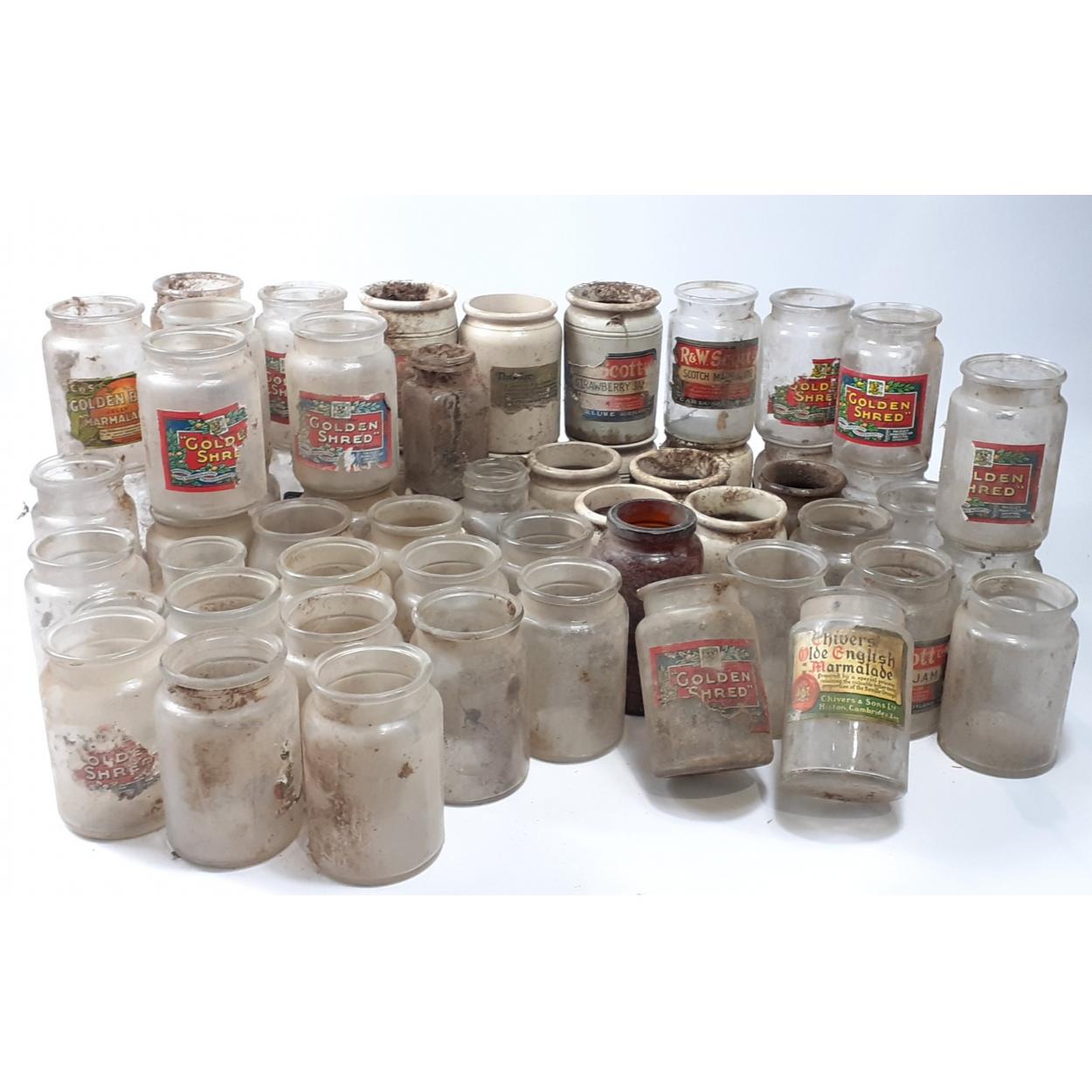A quantity of large vintage jam jars useful for upcycling projects, tealight holders etc