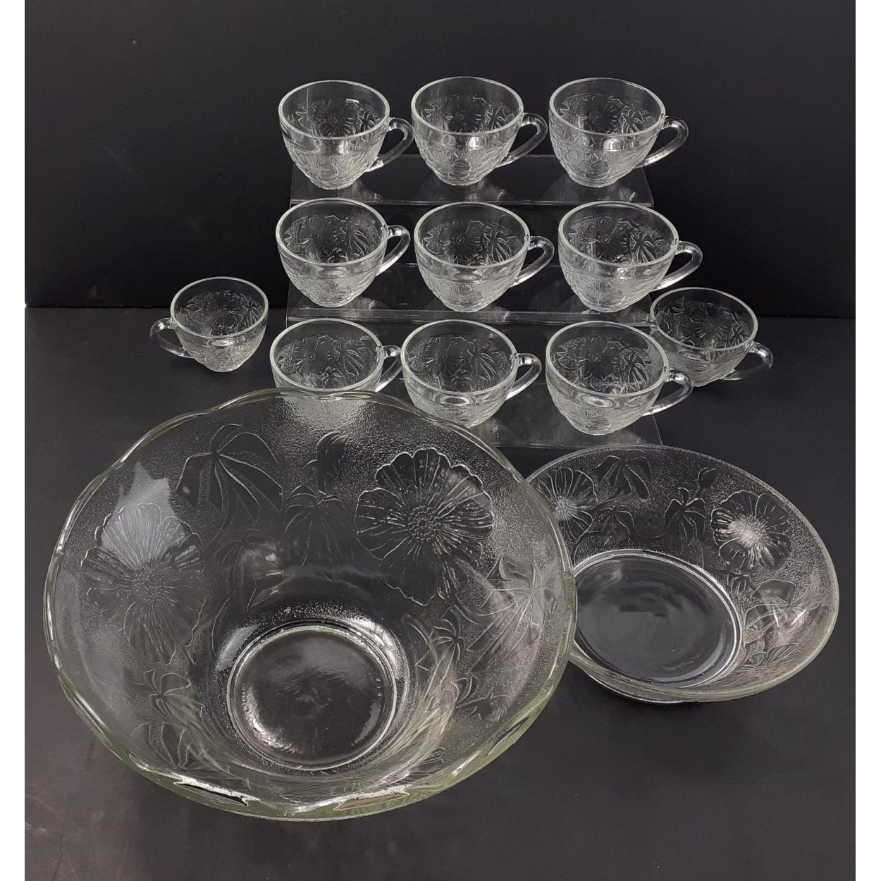 A large pressed glass punch bowl in good condition 32cm dia. with 11 cups and also a smaller matching bowl
