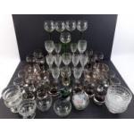 A box of useful glassware to include green stemmed wine glasses, crystal sherry glasses, and others