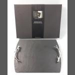 From THE JUST SLATE COMPANY an unused, very attractive slate cheese board with antler handles in original gift presentation box, 35cm width approx
