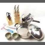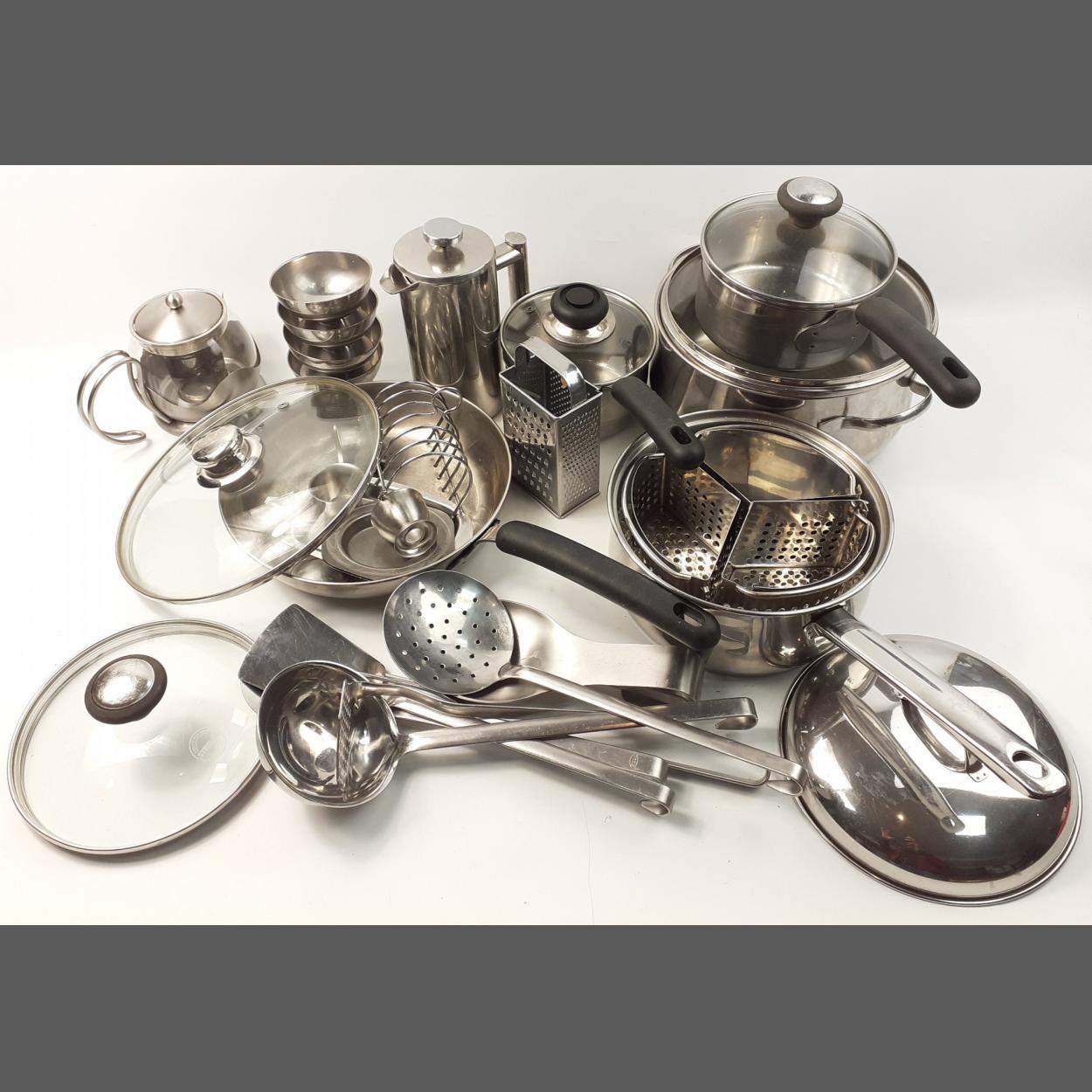 A STAINLESS STEEL KITCHENALIA LOT! - A large plastic tub containing a selection of kitchen utensils i.e. grater, strainer serving spoon and glass lidded pots n' pans - ideal for that AIRBNB or student accommodation etc