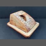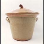 A lidded light brown pottery crock standing 18cm tall, in good condition