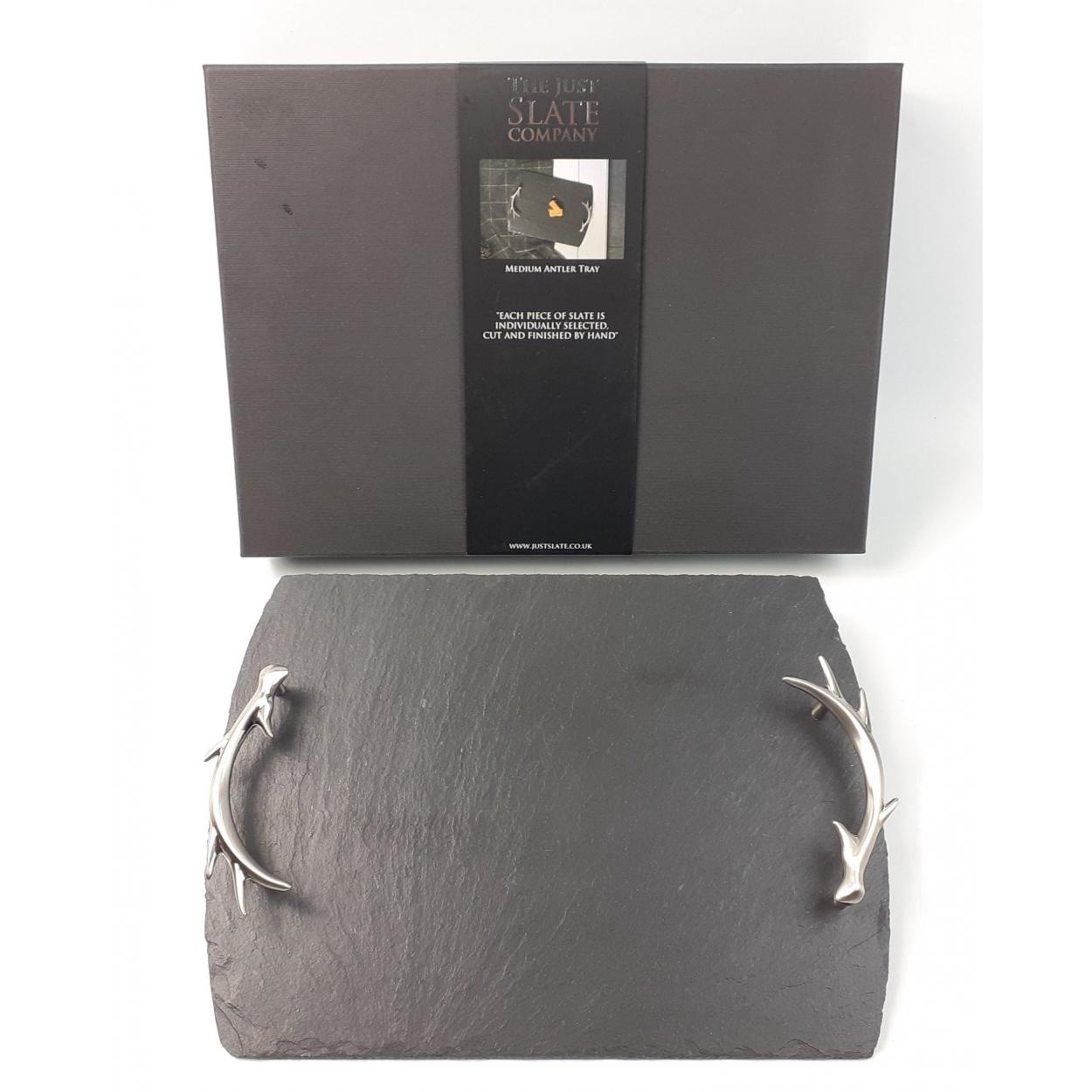 From THE JUST SLATE COMPANY an unused, very attractive slate cheese board with antler handles in original gift presentation box, 35cm width approx