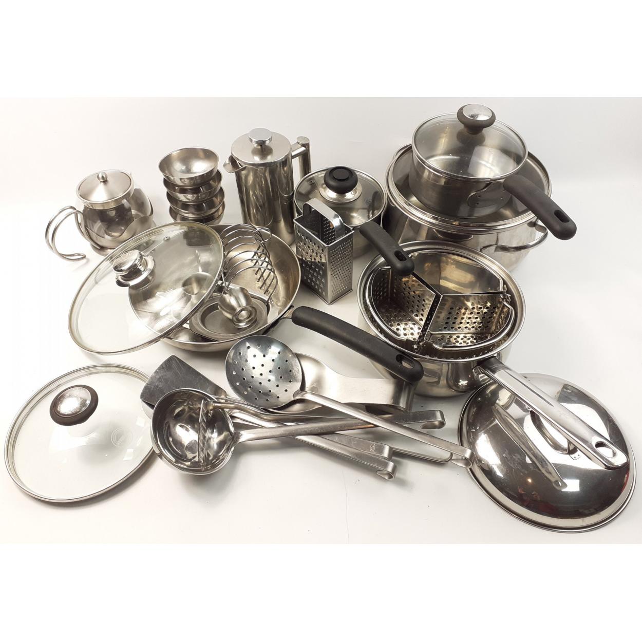 A STAINLESS STEEL KITCHENALIA LOT! - A large plastic tub containing a selection of kitchen utensils i.e. grater, strainer serving spoon and glass lidded pots n' pans - ideal for that AIRBNB or student accommodation etc