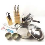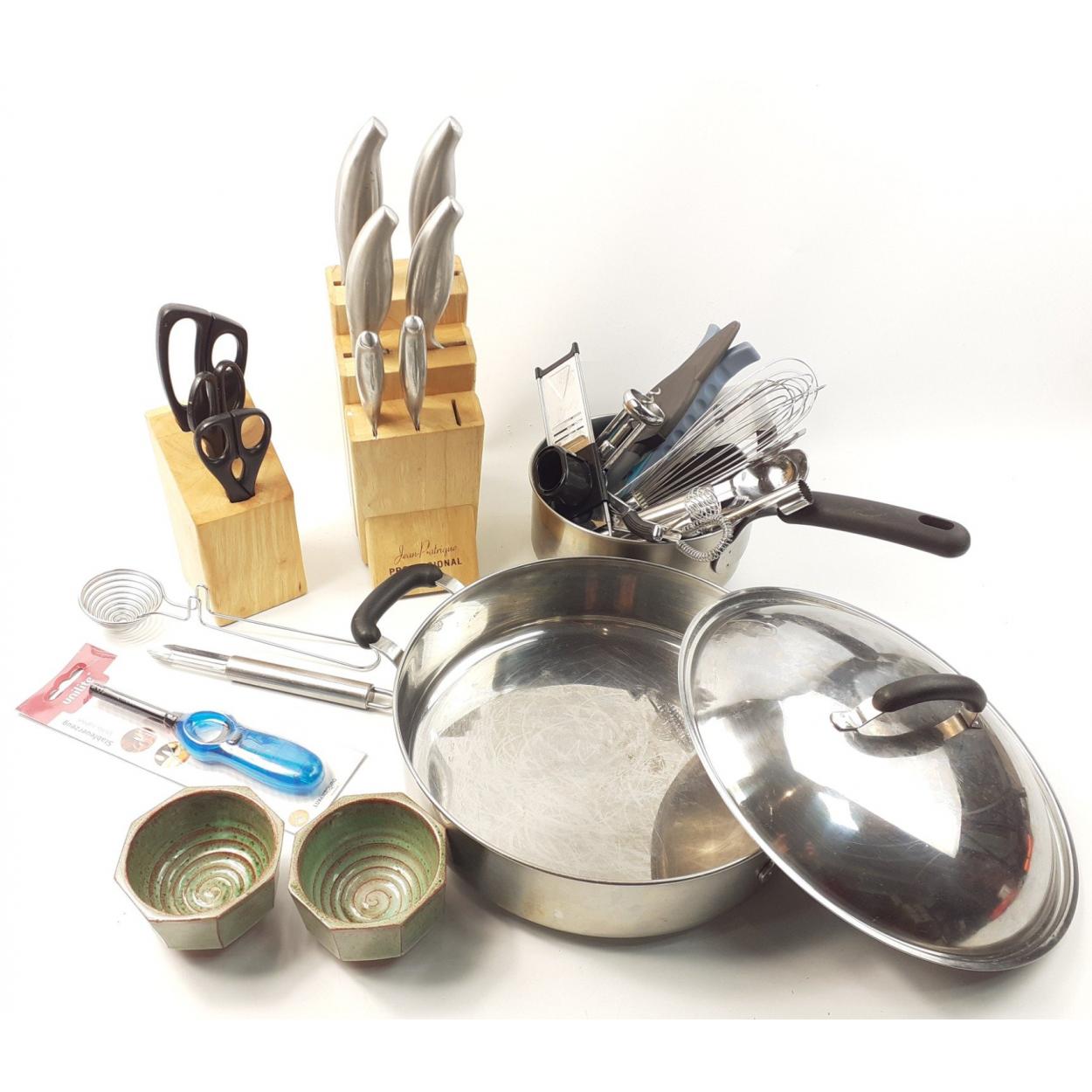 A box of kitchenalia to include a knife block with 6 Jean-Patrique Professional knives, a MYER Copperal lidded casserole, kitchen tools, 2 BUCKFAST ABBEY pottery dishes etc