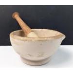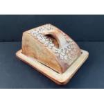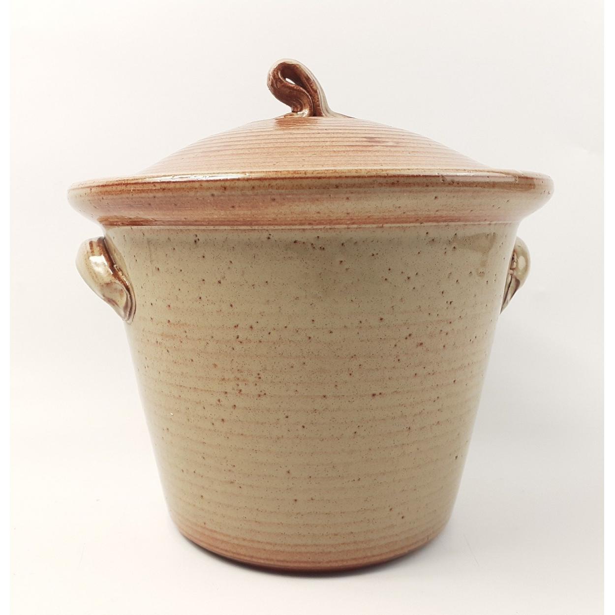 A lidded light brown pottery crock standing 18cm tall, in good condition