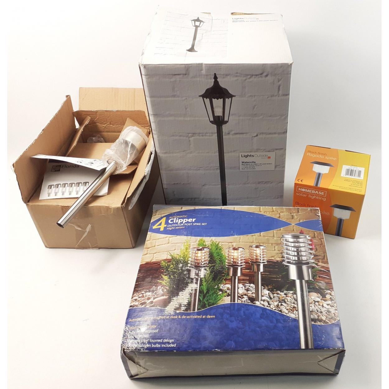 Outdoor lighting to include solar post spike sets, a post lantern, small spike sets,