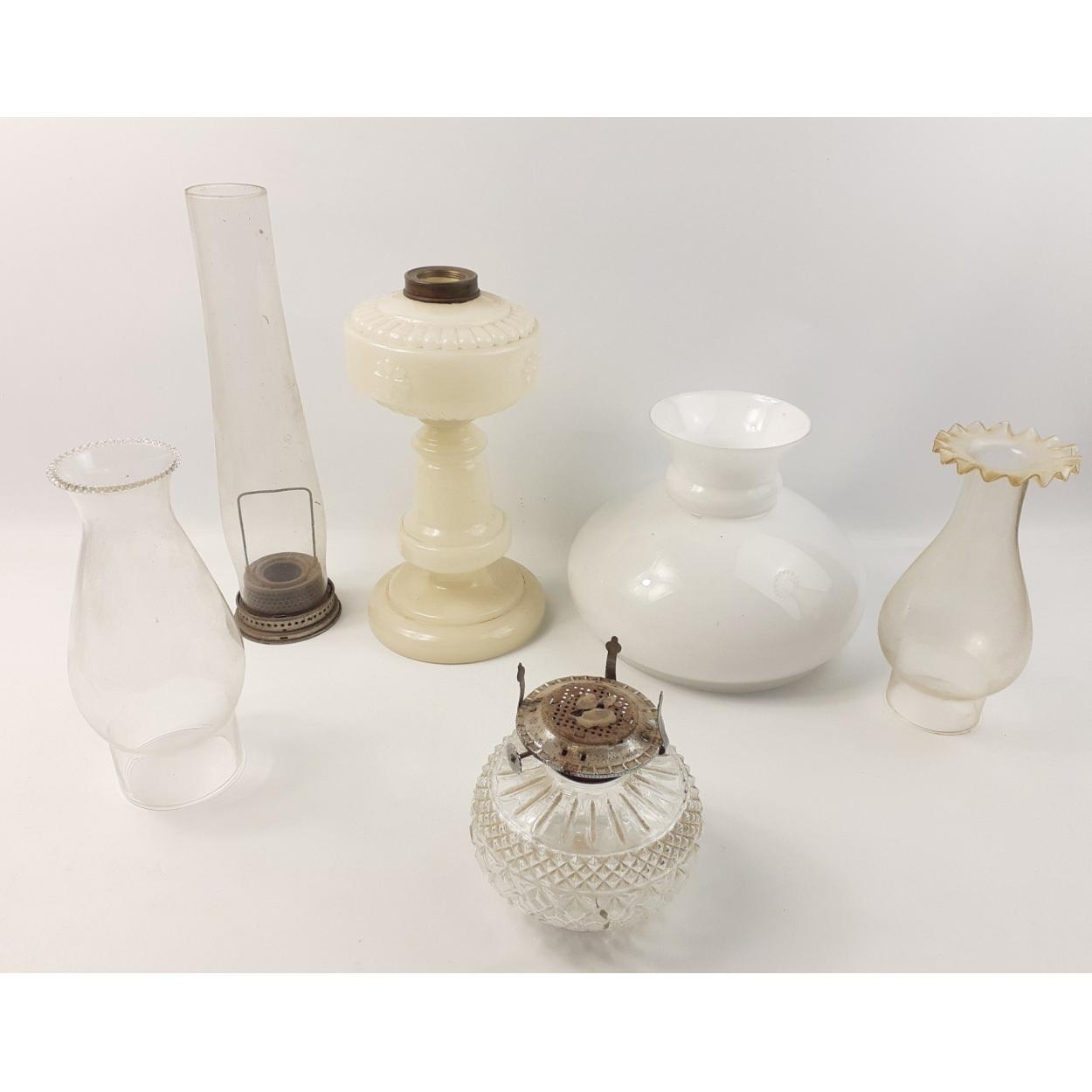 A mixed lot of oil lamps and accessories to include a glass-based oil lamp with chimney, a milk glass base, a glass shade and others