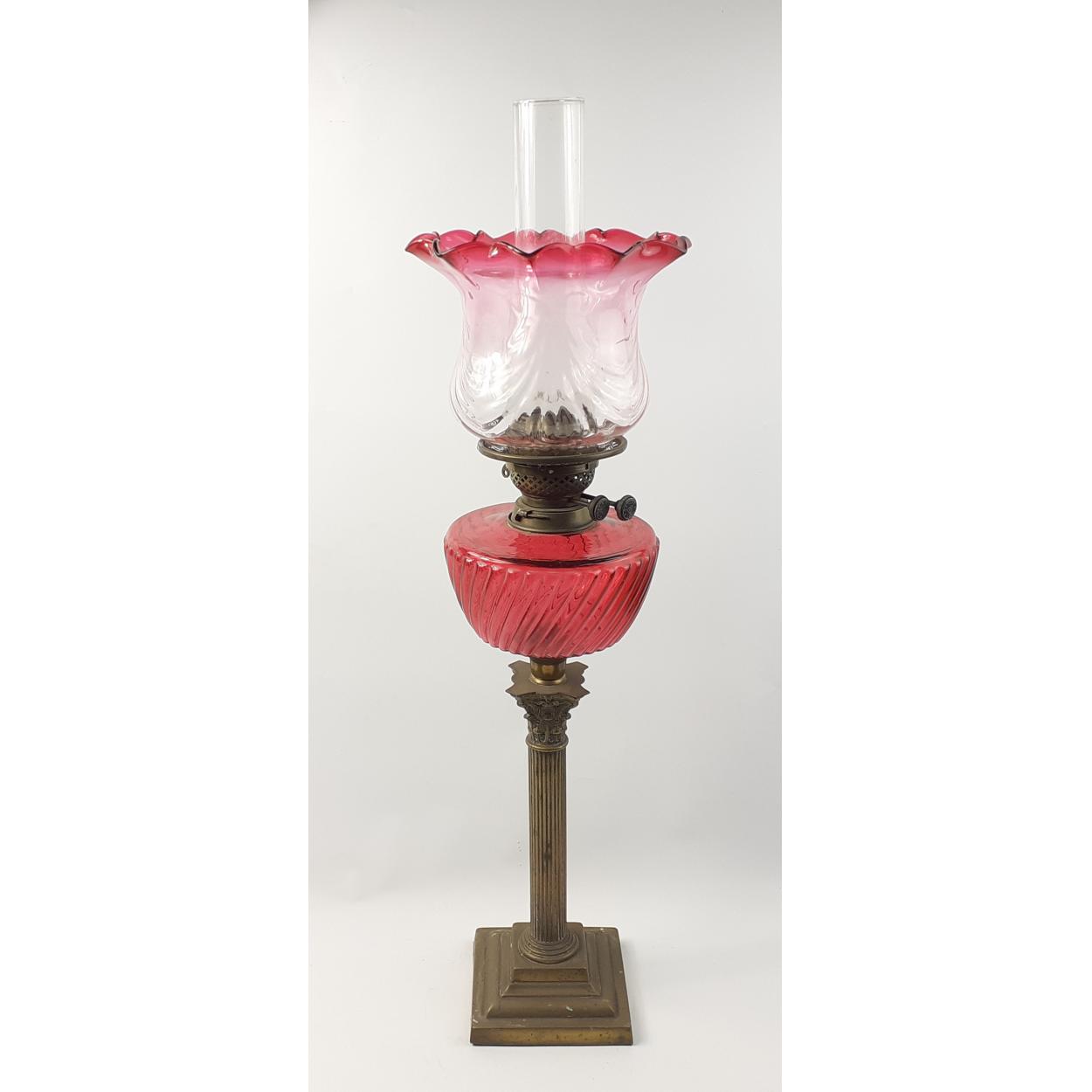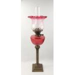 A majestic oil lamp with cranberry glass shade and reservoir on a brass column standing 70cm high. Wick control marked Best Duplex.