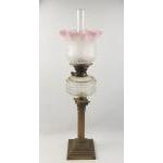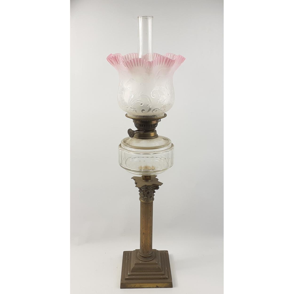 A stunning oil lamp with rose coloured shade and clear glass reservoir standing 70cm tall on a column base. Maker's mark Lewtas.