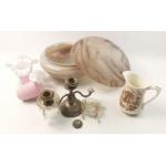 A wonderful collection of vintage glass lamp shades the largest 34cm diameter and a jug