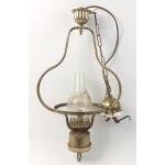 A brass hanging electric porch storm lamp which hung in one family's country home for over 60 years in as found condition