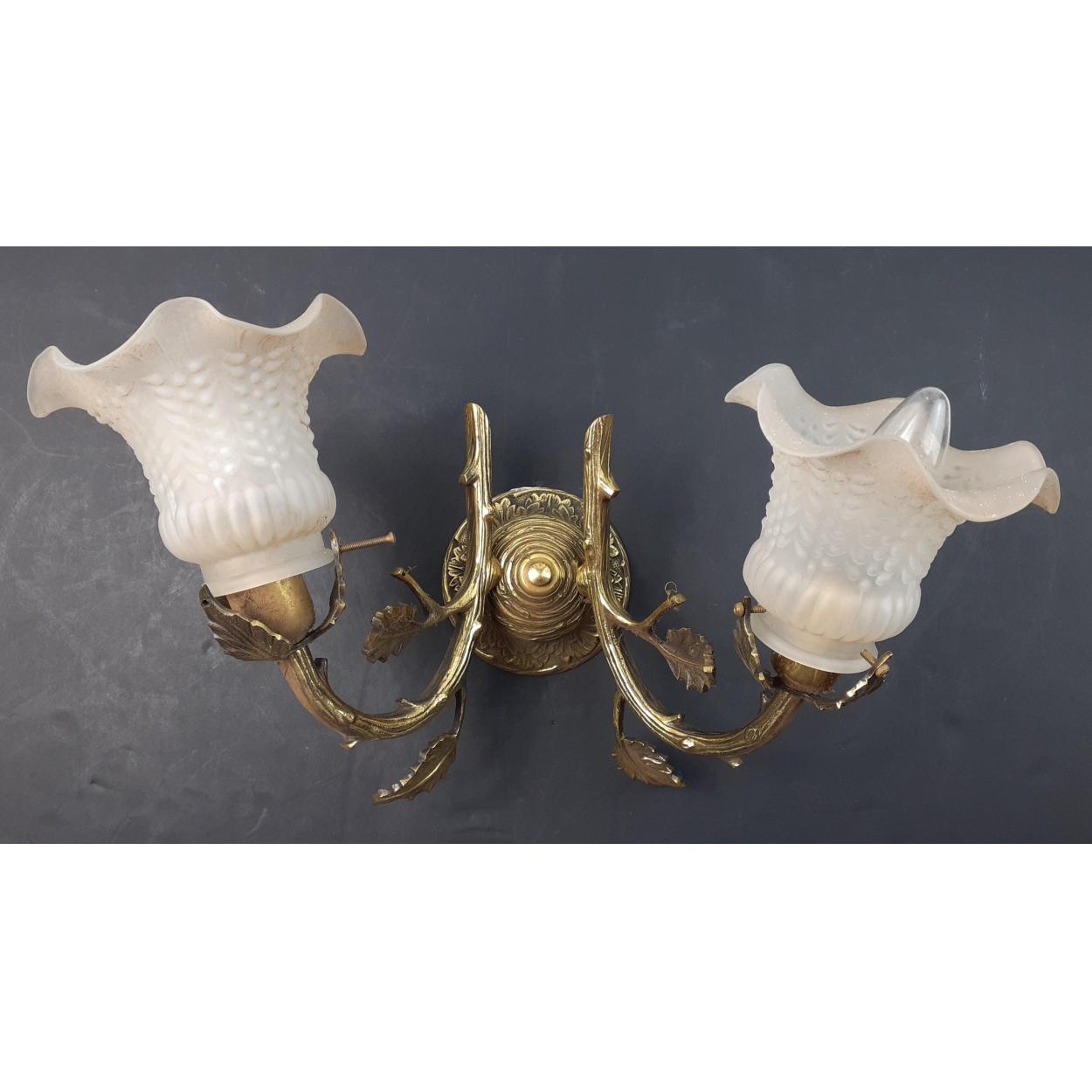 A brass two branch wall light fitting with opalescent shades approx 30cm diameter
