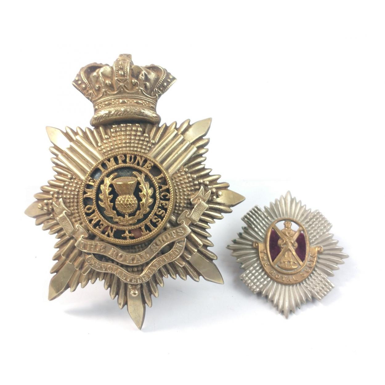 The ROYAL SCOTS original 19th century 6th VOLUNTEER BATTLION blue cloth helmet plate in stamped brass. Attributable to a pre-WWI enlisted soldier Willie Euman who went on to serve in WWI and survived the conflict remaining in the army until 1921. Willie was one of five brothers who served and remarkably survived WWI although one brother did die from the effects of gas in the 1920s. Also comes with Willie's standard field issue Royal Scots cap badge