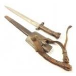 An excellent pre-WWI era British bayonet with original scabbard and frog, likely pattern 88 Mark I sword bayonet believed to be by Wilkinson marked 10 8 with VR cipher and later GR cipher, blade 30cm long. Heavily greased before storage and therefore in remarkably good condition. The leather on the frog is also excellent.