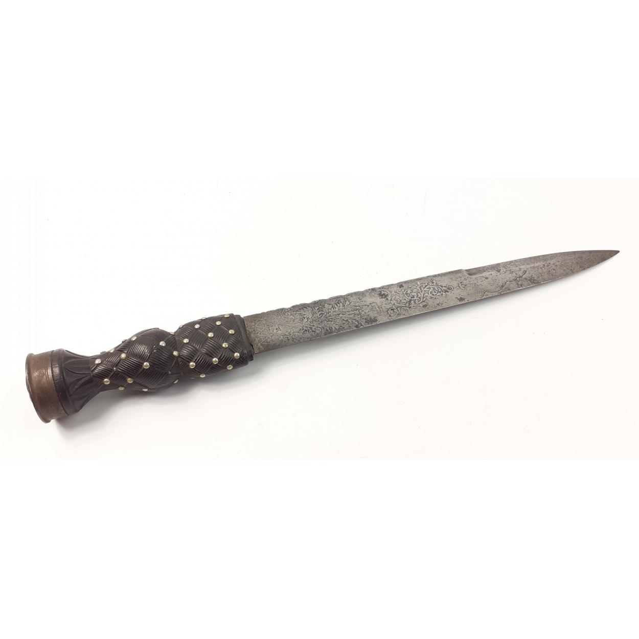 An antique Victorian Highland Pipers dirk / dagger 30cm long with etched blade, and Victorian proof stamp. Maker Reeves of Birmingham. No scabbard, with damage. Victorian Crown to boss on pommel