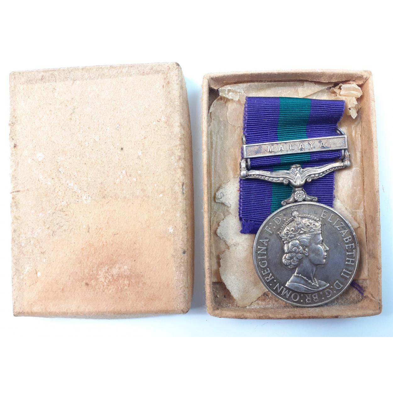 A boxed QEII general service medal with Malaya bar, named on rim to 23022190 Pte. A Brown KOSB