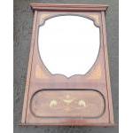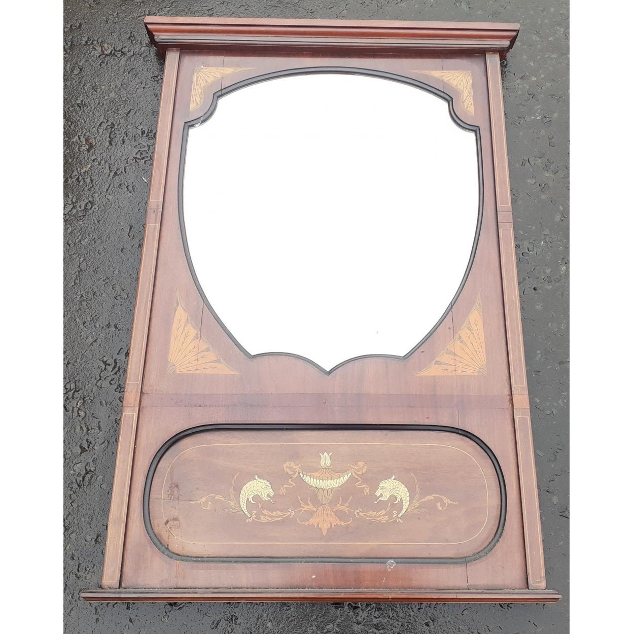 An antique bevelled shield-shaped glass wall mirror with dolphinesque motif inlay measures 106 x73cm. This item matches the bow-fronted sideboard. A beautiful piece.