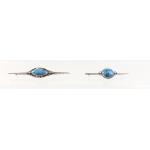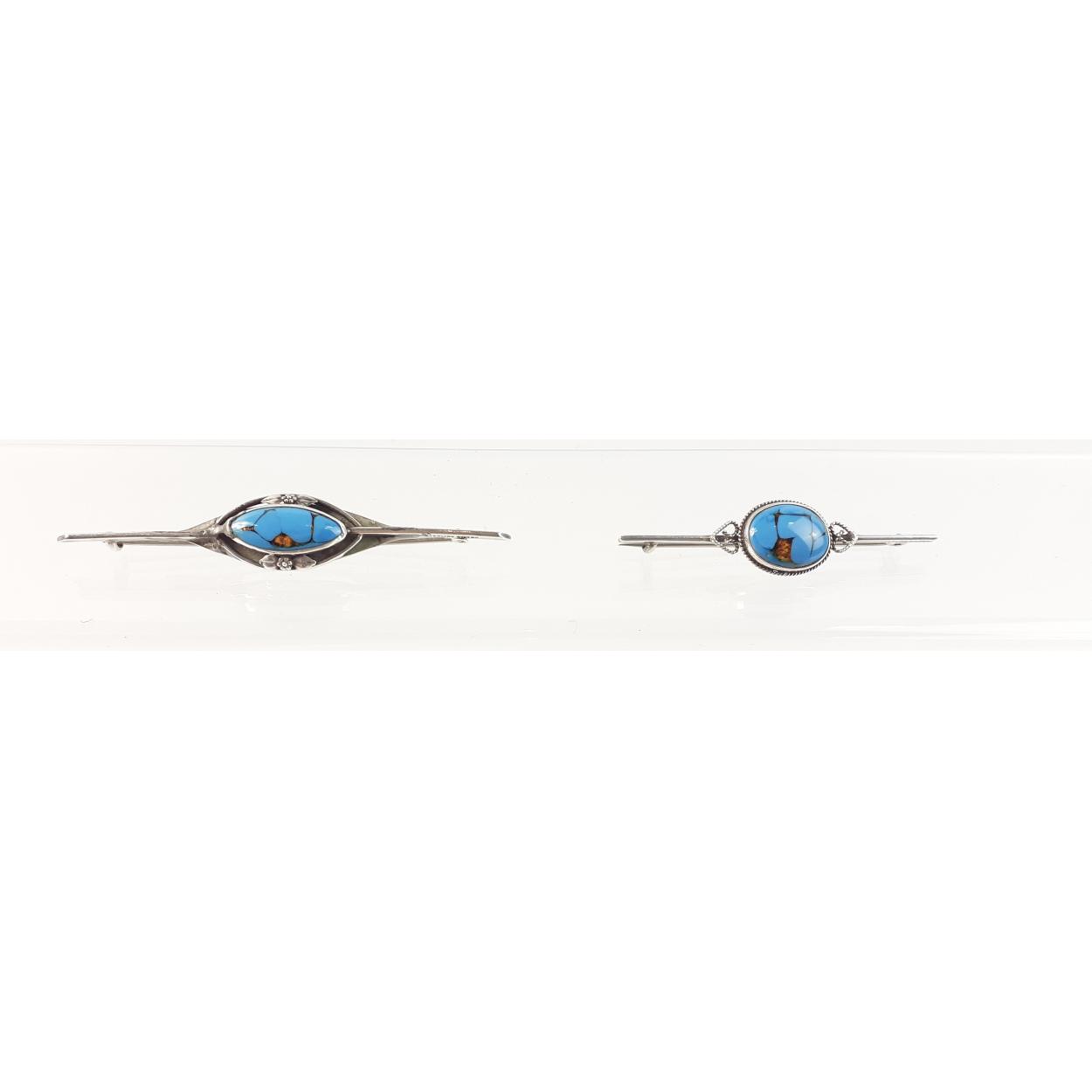 Two pretty STERLING SILVER pin brooches both with turquoise centre stones. The smaller brooch has twisted heart motifs and the larger appears to have signs of repair. Both very attractive pieces. The larger 8cm long approx.