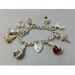 A sterling silver hallmarked charm bracelet with ten wonderful articulated charms and a padlock clasp to include ball and claw with orange stone, Aladdin's lamp, a corgi, carriage lamp, a pair of clasped hands with a pram inside, penny farthing bicycle with moving wheels, mantle clock and others. Total gross weight 65.35g approx