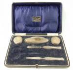 A silver hallmarked manicure set in presentation box from George K Paul of Lothian Road, Edinburgh. Three items with handles hallmarked for Birmingham 1919 and 2 small pots dated 1918 (with initials BM). Gross weight 70g approx. Scissors are missing from the set.