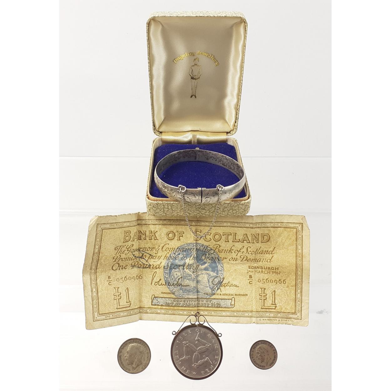 A silver snap shut bangle with safety clasp, fully hallmarked Birmingham 1979, weighs 24.6g approx, a coin in a silver mount, and a Bank of Scotland £1 note from 1967