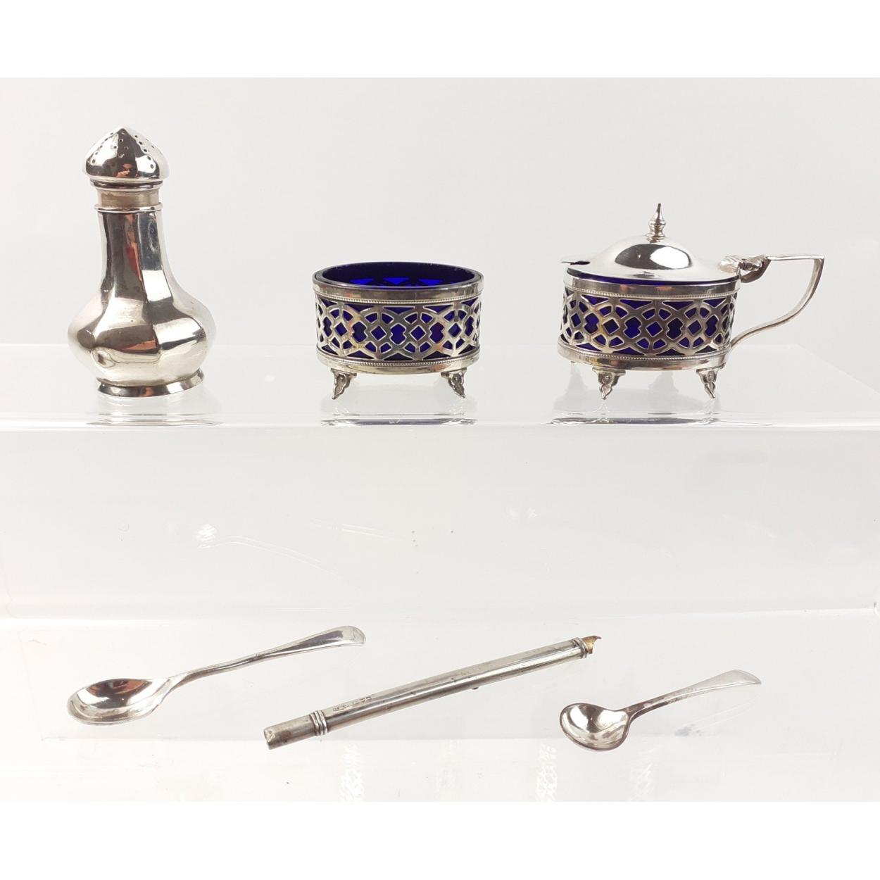 A small silver hallmarked lot to include a rather beautiful pepper pot, 2 condiment pots (with Bristol blue liners, one with chips) 2 mustard spoons and a propelling pencil. Gross weight 91g approx, exc. liners