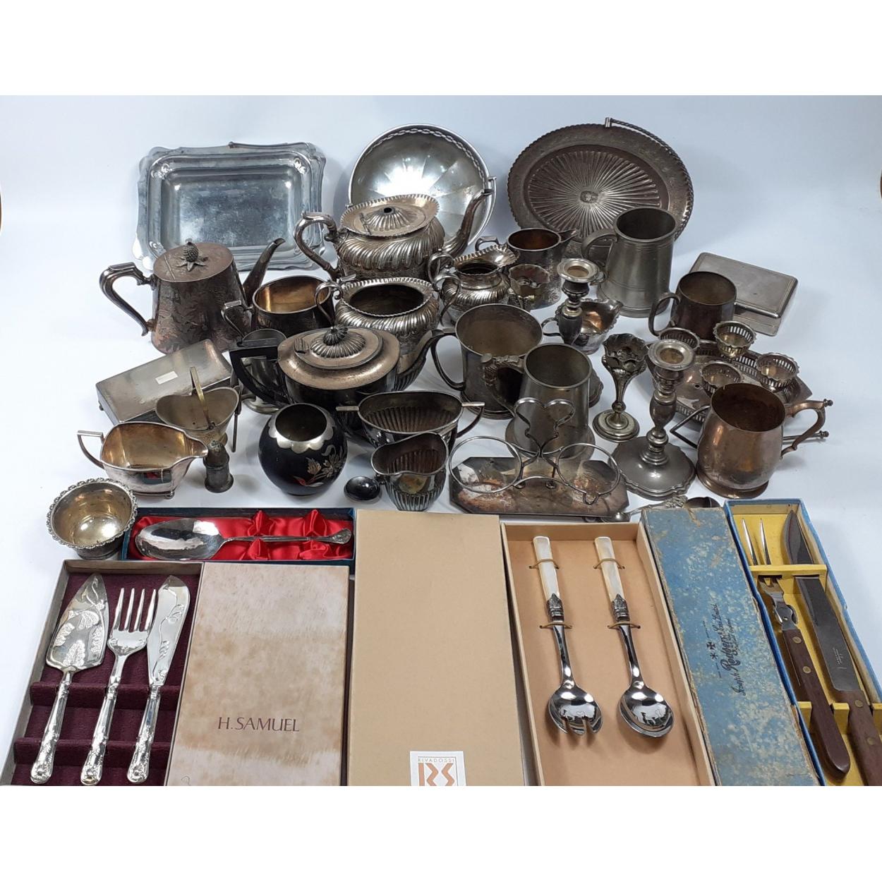 A mixed lot of EP to include trays, tankards, teapots, bowls, and 2 plated cigarette boxes etc