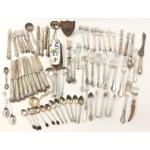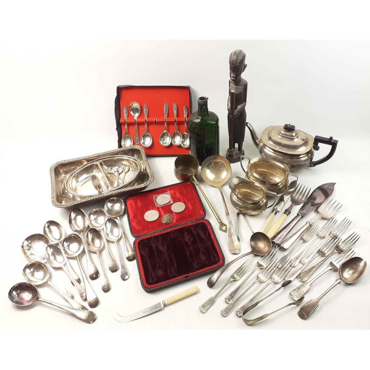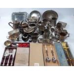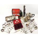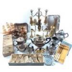 A mixed plated lot to include 2 trays, teapot, sugar and cream, much flatware and others