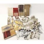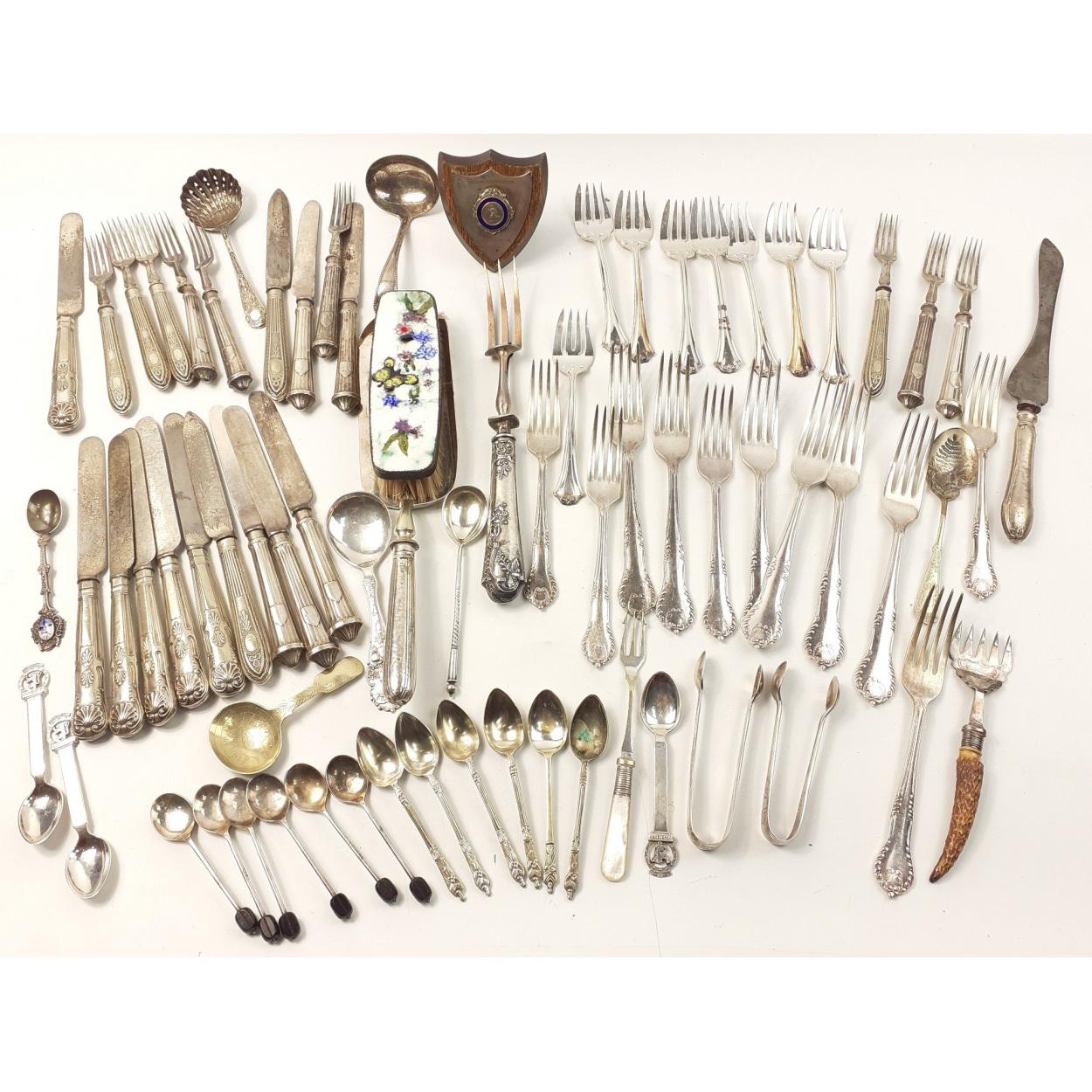 A selection of EP flatware to include glove stretchers, Walker & Hall ladle, a small brass candlestick etc.