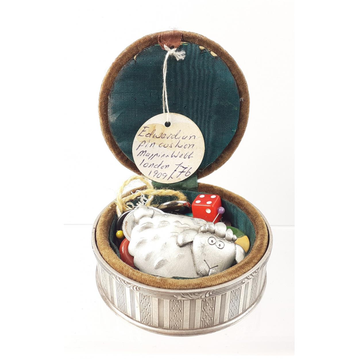 An ANTIQUE pin cushion with silver ring by MAPPIN & WEBB hallmarked, London 1909, weighing approx 39.6g approx, with contents, approx 8cm diameter