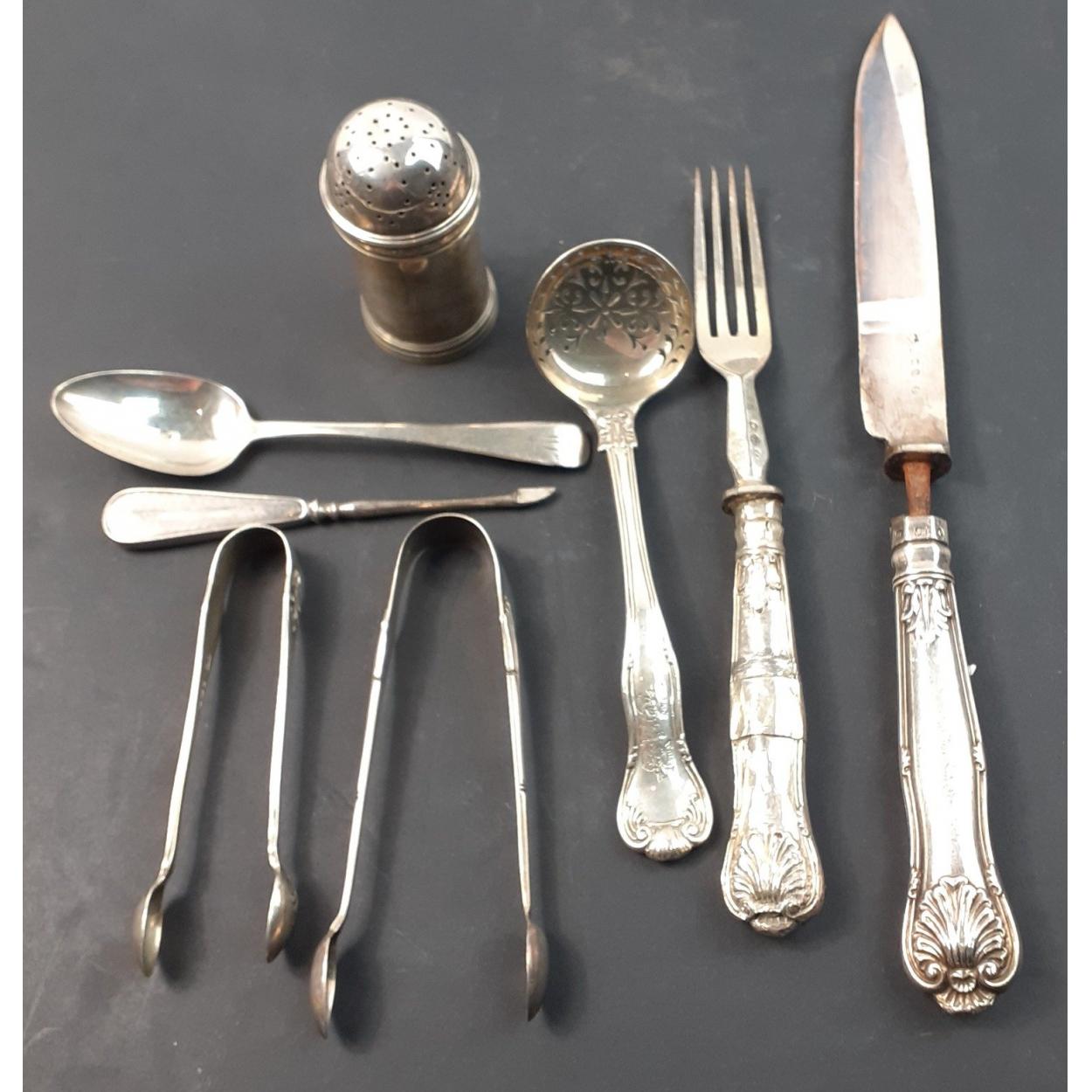 A small collection of silver items of interest to include a small MAPPIN & WEBB sifter (73.5g approx), a Victorian tea strainer (67g approx), 2 pairs of hallmarked nips (51g approx), a Georgian teaspoon (18g approx), 2 silver handled pieces of cutlery