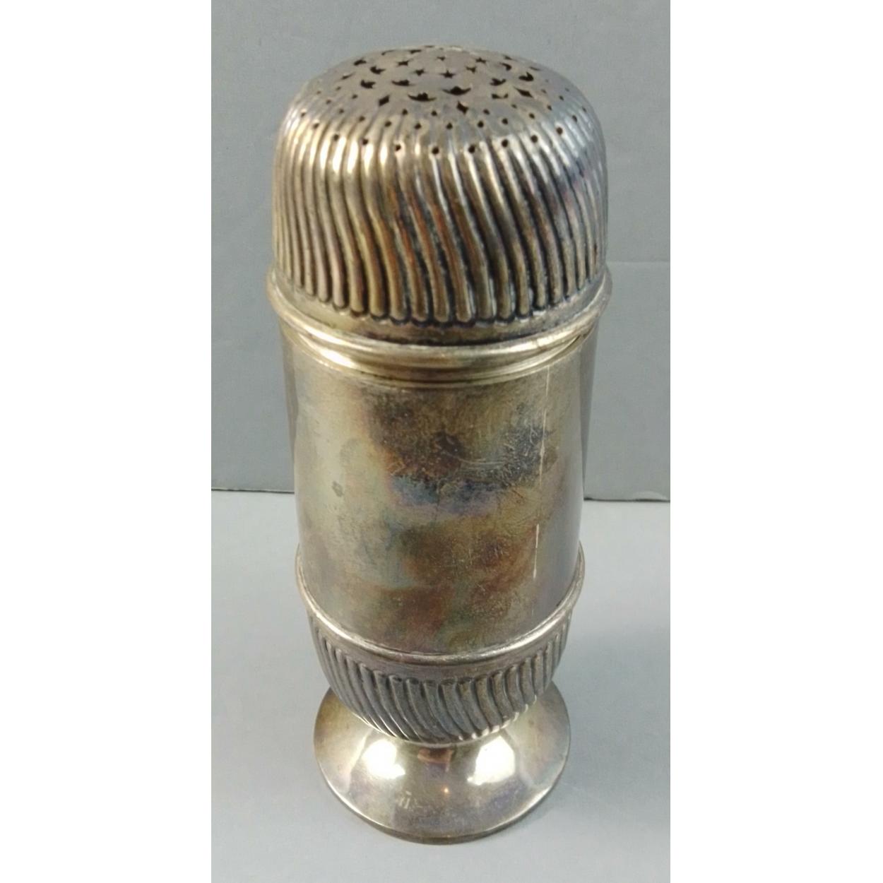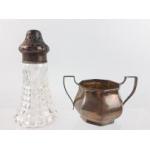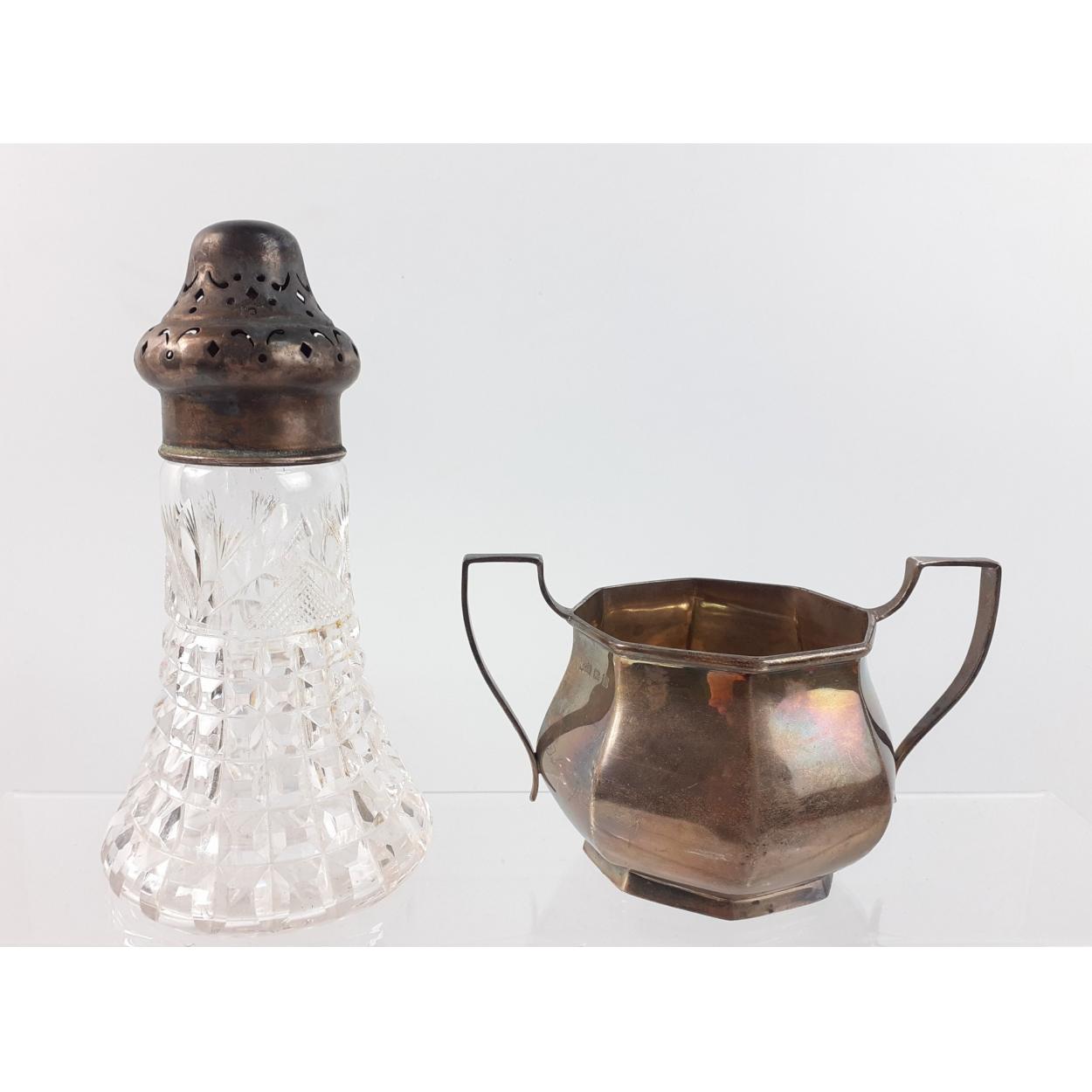 A silver hallmarked sugar bowl, hallmarked Birmingham 1911, weight 104g approx, and a cut glass sifter with silver top Sheffield 1924 by WALKER & HALL, weight 37g approx