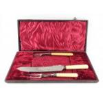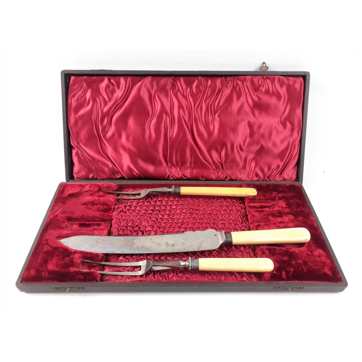 A carving set by John Anderson with silver collars hallmarked for Sheffield. Steel missing in presentation box with detached lid