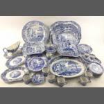 A large mixed collection of old and modern SPODE BLUE ITALIAN china to include three graduated ashets, largest 40cm approx, 1 oval serving dish (35cm), 1 square lidded serving dish (slight nibble noted to the finial), a large modern plate (32cm), 1 square open serving dish, 8 coffee cans, 10 saucers (2 AF), 1 sauceboat with underplate, 2 egg cups, and much else. An impressive lot