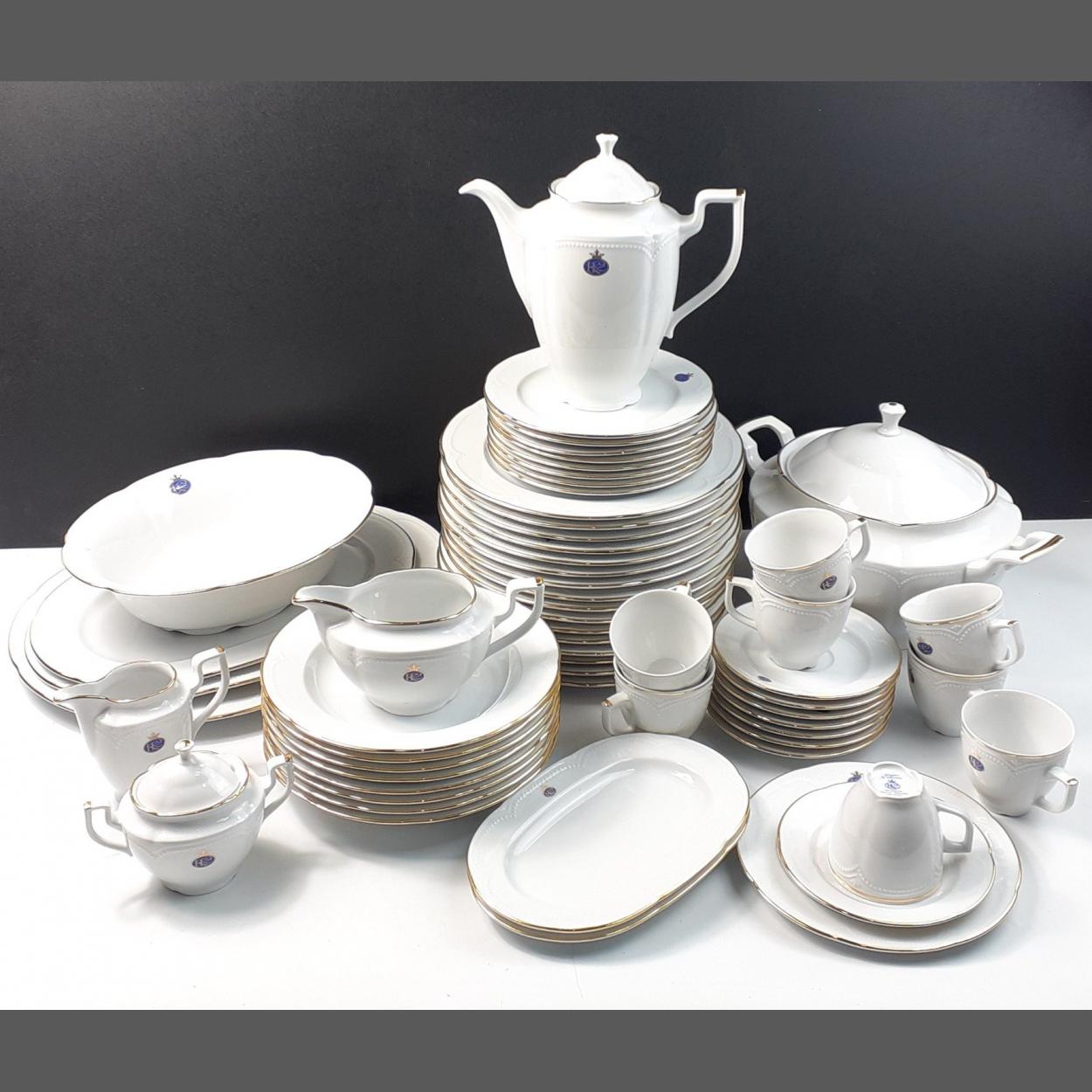 REGINA KATHERINA, GRAF VON HENNEBERG. A substantial West German fine porcelain dinner service of exceptional quality consisting of a large lidded tureen, three large serving plates, 15 x 26cm plates, 9 x side plates, 8 x cups and saucers, 8 shallow bowls, coffee pot, sugar, milk and cream with trays. A beautiful gold edged set in excellent condition.
