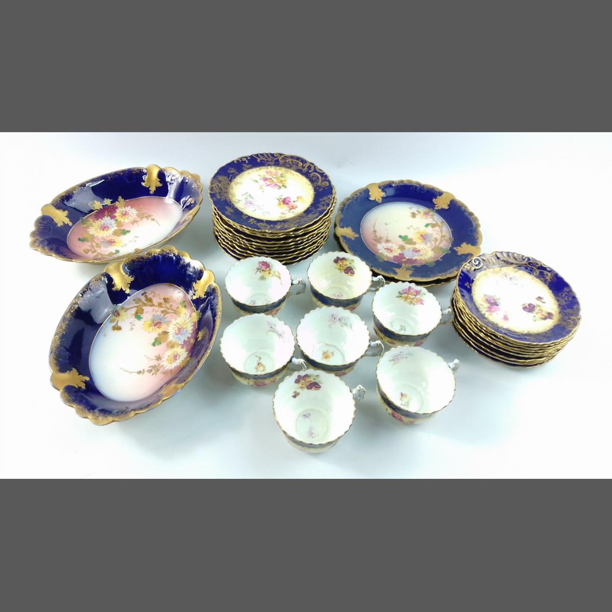 A pretty vintage tea service in cobalt blue with gilt edgings to include 7 cups, 10 saucers, 11 side plates, plus 2 decorative plates and 2 oval bowls. Three cups have some cracks and a couple have stains from use but remain attractive items.