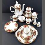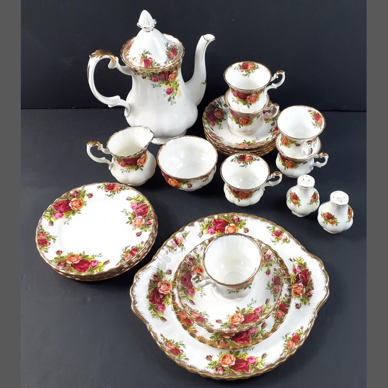 A ROYAL ALBERT Old Country Roses coffee service comprising a serving tray, 6 cups, 6 saucers, 6 side plates, 1 coffee pot (with residue), 1 sugar bowl and creamer, salt and pepper