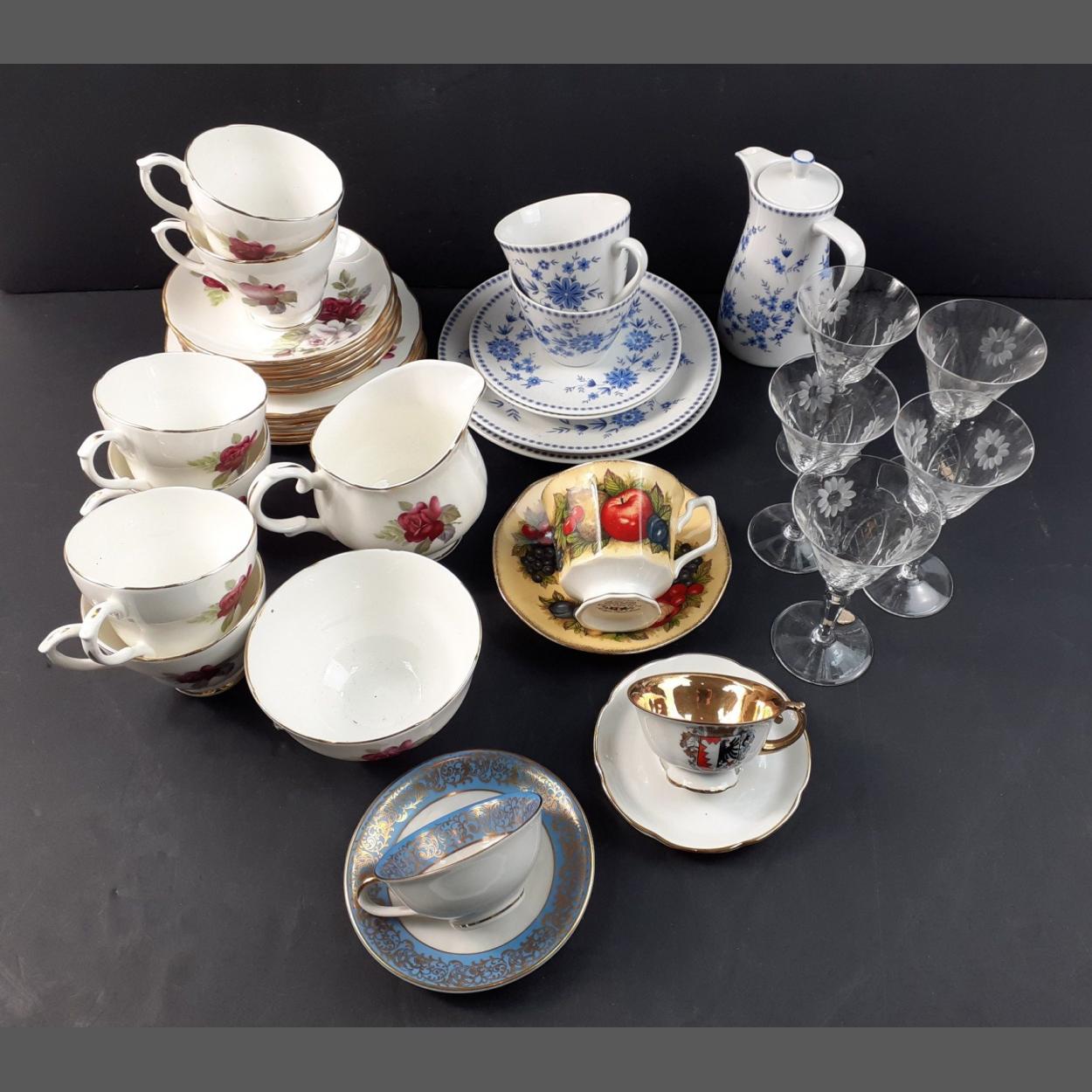 A mixed selection of China to include a DUCHESS bone china tea set with 6 each of cups, saucers, sugar and cream and a quantity of other pieces and also 5 crystal sherry glasses