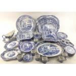 A large mixed collection of old and modern SPODE BLUE ITALIAN china to include three graduated ashets, largest 40cm approx, 1 oval serving dish (35cm), 1 square lidded serving dish (slight nibble noted to the finial), a large modern plate (32cm), 1 square open serving dish, 8 coffee cans, 10 saucers (2 AF), 1 sauceboat with underplate, 2 egg cups, and much else. An impressive lot