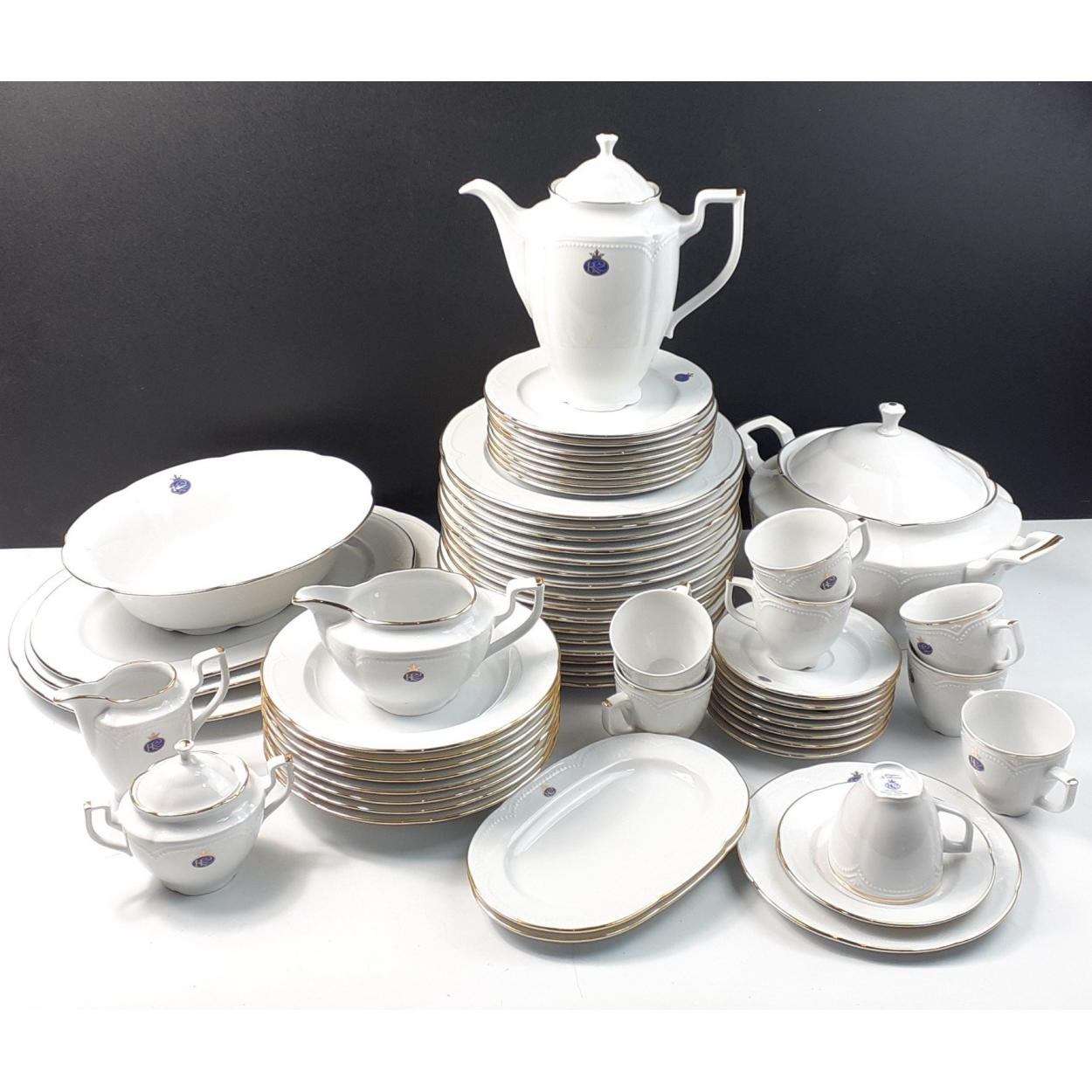 REGINA KATHERINA, GRAF VON HENNEBERG. A substantial West German fine porcelain dinner service of exceptional quality consisting of a large lidded tureen, three large serving plates, 15 x 26cm plates, 9 x side plates, 8 x cups and saucers, 8 shallow bowls, coffee pot, sugar, milk and cream with trays. A beautiful gold edged set in excellent condition.