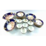 A pretty vintage tea service in cobalt blue with gilt edgings to include 7 cups, 10 saucers, 11 side plates, plus 2 decorative plates and 2 oval bowls. Three cups have some cracks and a couple have stains from use but remain attractive items.