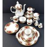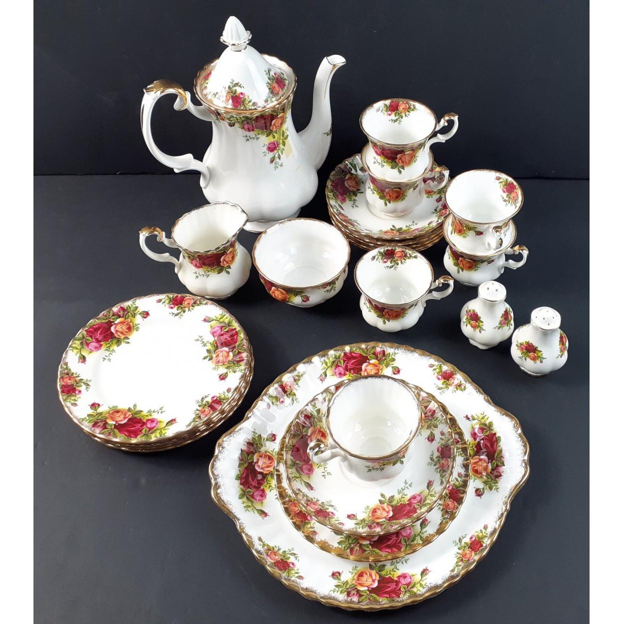 A ROYAL ALBERT Old Country Roses coffee service comprising a serving tray, 6 cups, 6 saucers, 6 side plates, 1 coffee pot (with residue), 1 sugar bowl and creamer, salt and pepper
