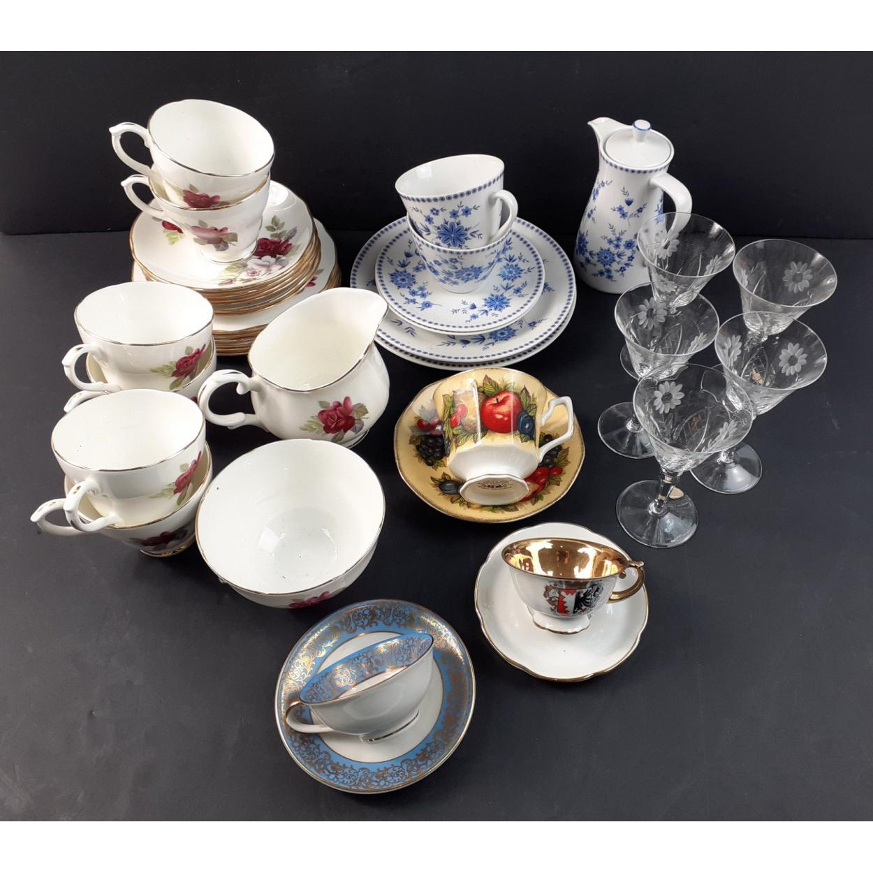 A mixed selection of China to include a DUCHESS bone china tea set with 6 each of cups, saucers, sugar and cream and a quantity of other pieces and also 5 crystal sherry glasses